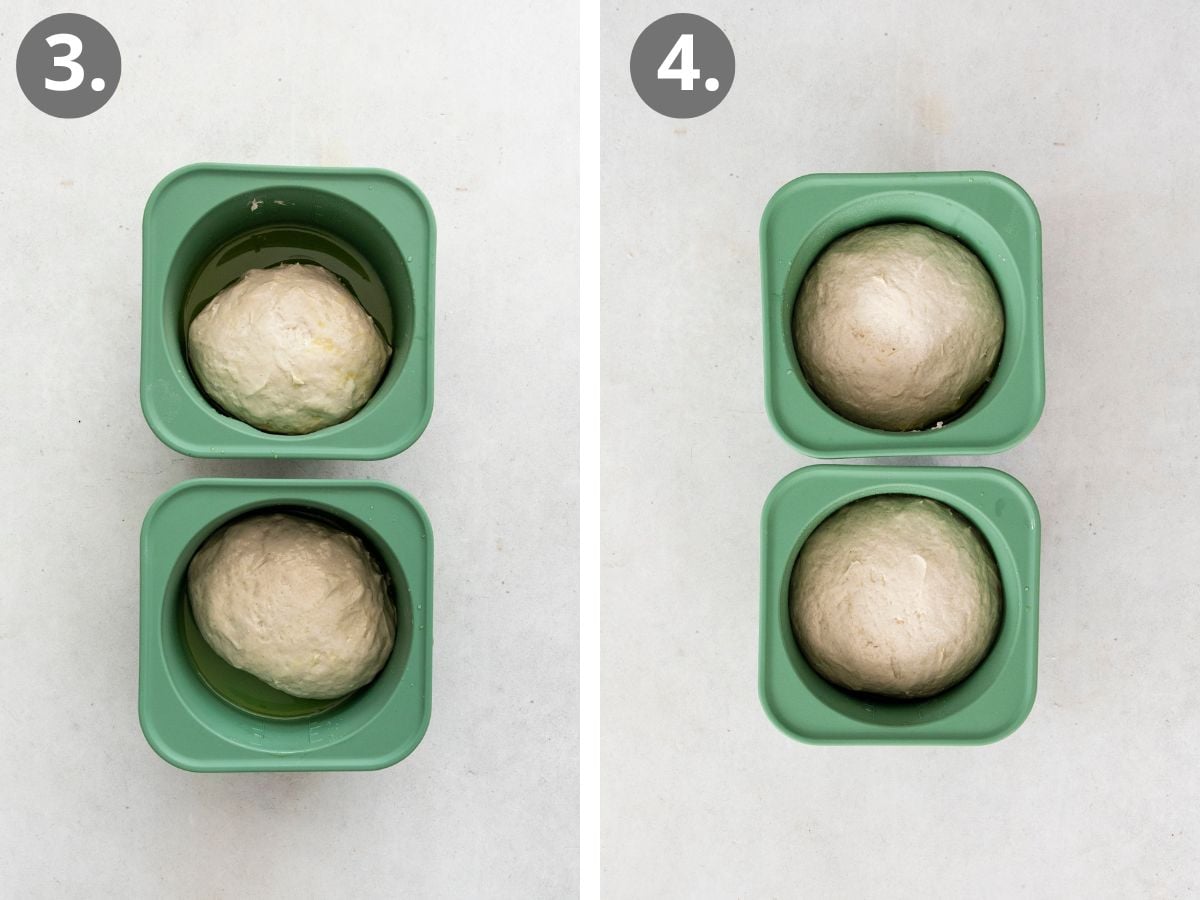 - Lightly drizzle olive oil into 2 small Tupperware or dough containers and use your fingers or a pastry brush to coat the bottom and sides. Form half the dough (316g) into a ball and place into the container. Repeat with the second dough ball. Cover tightly with a lid and refrigerate overnight or up to 2 days. (If baking the same day, skip the refrigerator and let the dough rise covered at room temperature for about 2-3 hours.)